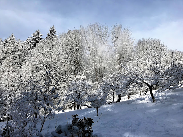 Pipers Orchard, wind was causing a secondary snowstorm to fall from the trees...